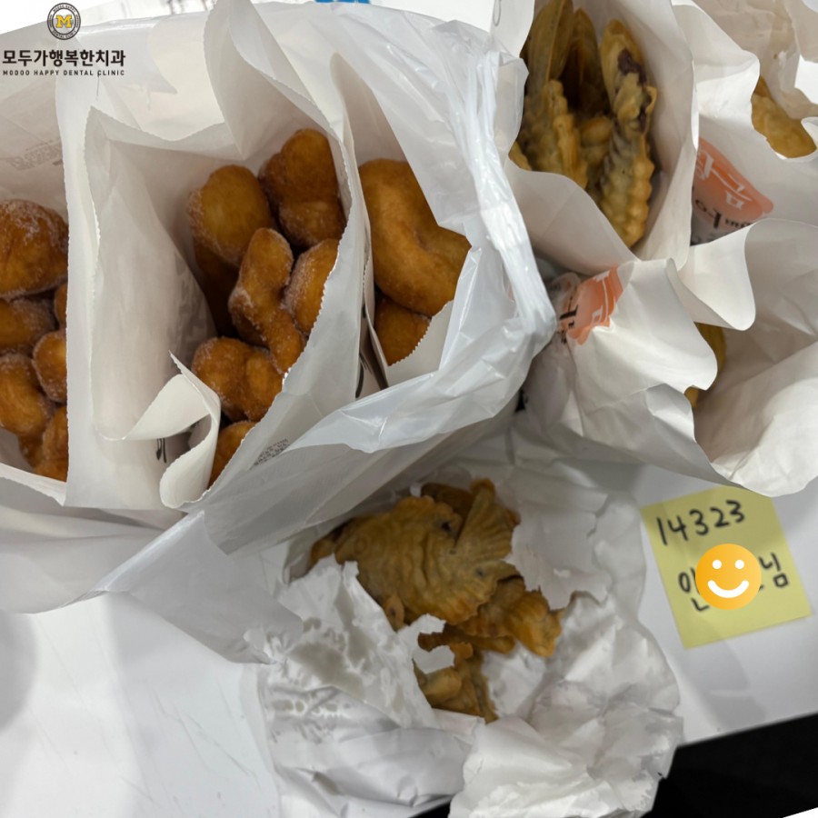 모두가행복한치과에서 임플란트 진료를 받으신 안*진님께서 붕어빵과 꽈배기선물을 주셨습니다