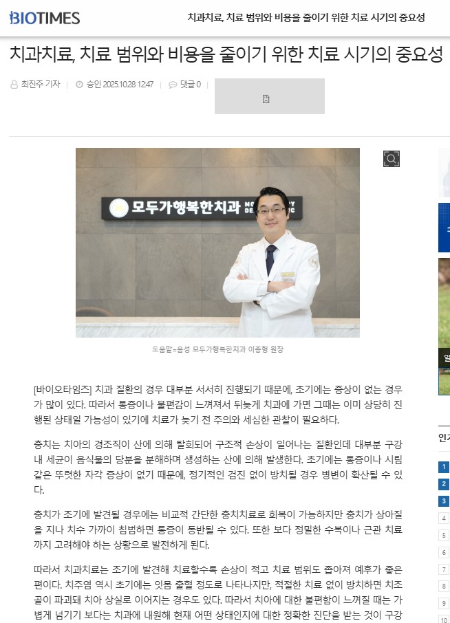 음성 모두가행복한치과 이종형 원장은 “치과 치료 시점은 조기에 대응하는 것이 가장 확실한 예방법이 될 수 있기에 일년에 한 번 이상 반드시 스케일링과 함께 정기적인 구강 검진을 위해 치과에 내원하셔서 병변이 있는 경우에는 조기에 발견하고 늦지 않게 치료해 치료범위와 비용 기간을 모두 줄이며 치아건강을 지켜 나가기를 바란다" 고 말했다.